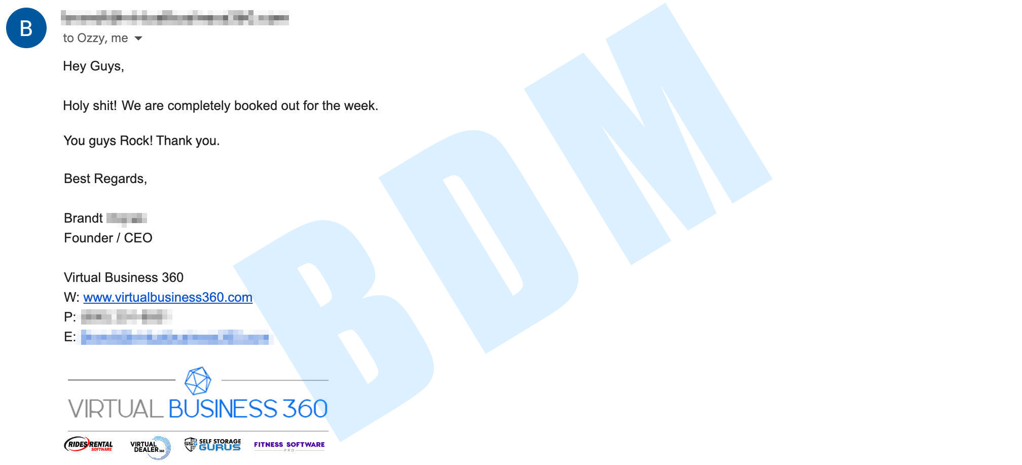 Brandt is successful 8 figure SaaS company owner who is selling all-in-one hosting/management solutions for 5 figures to rental and dealership companies.With our help through the last 18 months he scaled his company from 7 to 8 figure revenue and launched 2 additional verticals.What we did for him that changed the game was, we created extremely specific content that can only be of interest to the clients he closed & wanted the most, and we found the concepts those people were most interested in.P.S. He also had to hire 2 additional sales guys to handle the lead volume. (Good problem to have..)